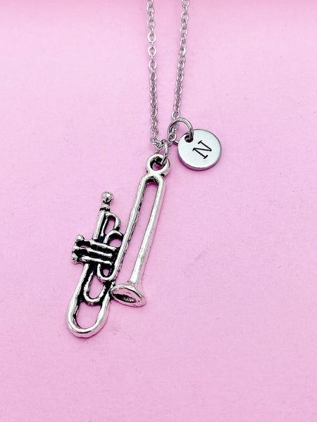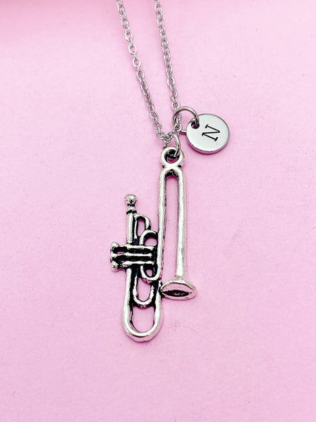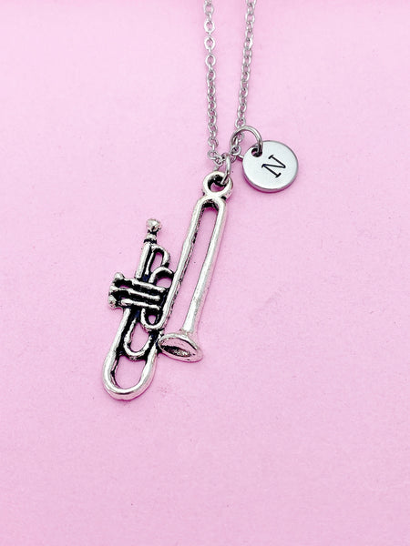 This is a silver-tone alloy trombone charm with hand stamped initial charm on brass or stainless-steel chain.