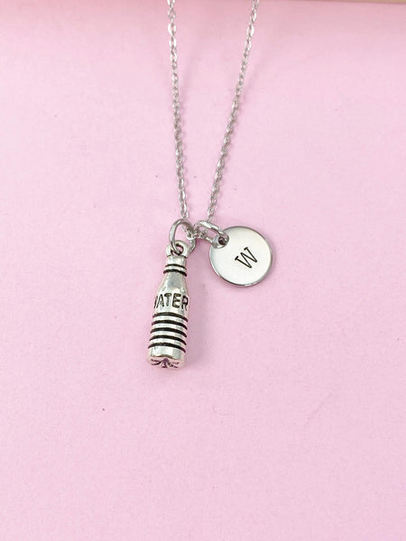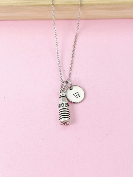This is a silver-tone water bottle charm with hand stamped initial charm on tarnish resistant stainless-steel chain.