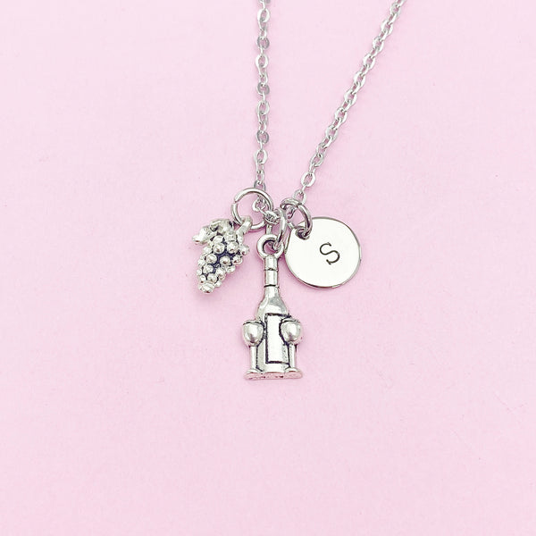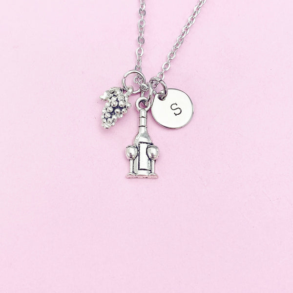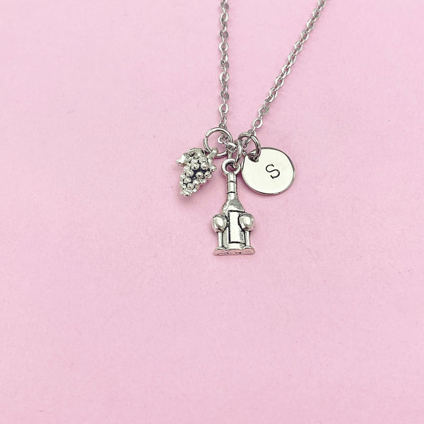 This is a silver-tone wine bottle goblet and grape charm with hand stamped initial charm on stainless steel necklace.