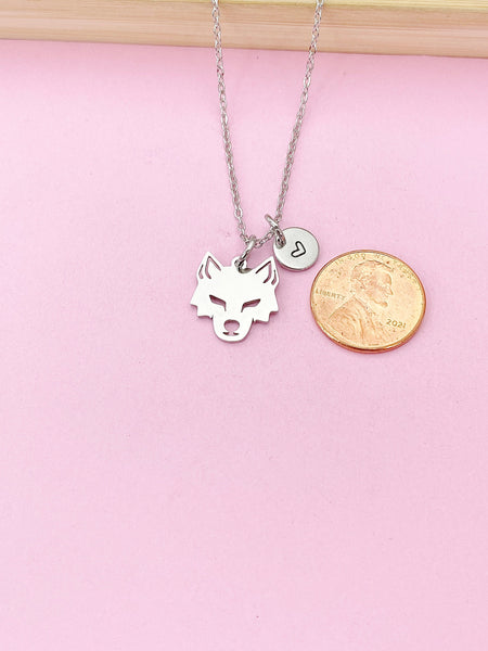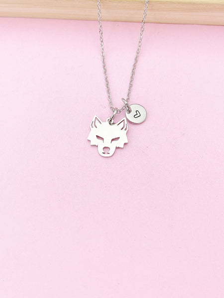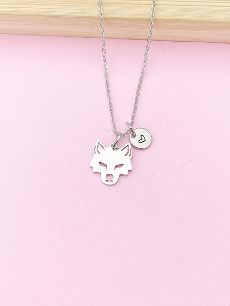 This is a stainless-steel wolf charm with hand stamped initial charm on brass or tarnish resistant stainless-steel chain.