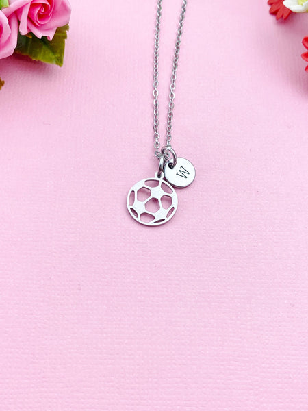 This is a silver or gold -tone soccer charm with hand stamped initial charm on stainless steel 18 inches chain.