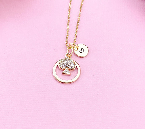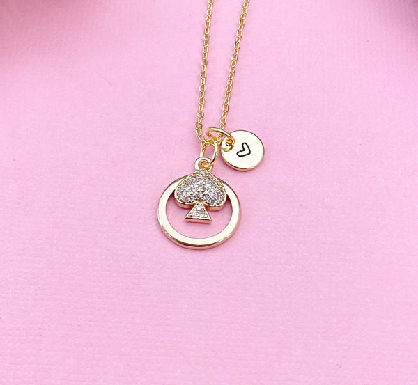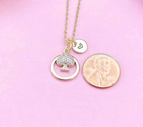 This is a gold-tone Spade charm with hand stamped initial charm on brass/stainless steel 18 inches chain.