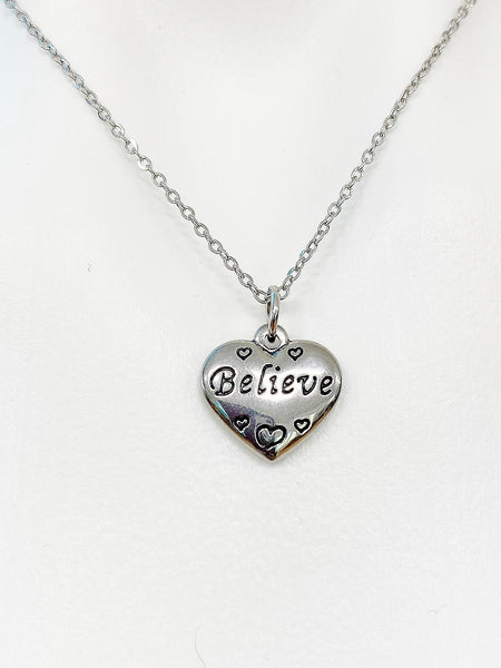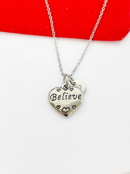 This is a stainless-steel heart Believe charm with hand stamped initial charm on a stainless-steel chain.