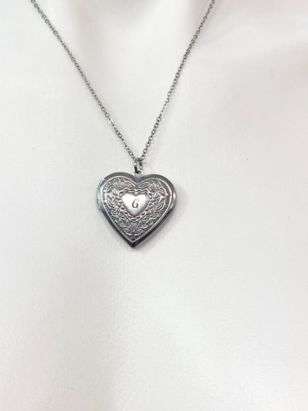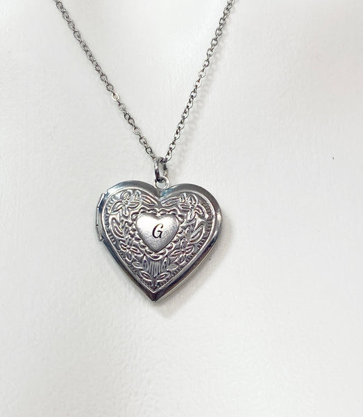 This is a unique engraving initial on stainless steel heart locket charm on 18 inches stainless steel necklace chain.