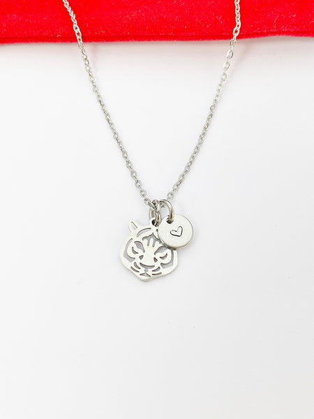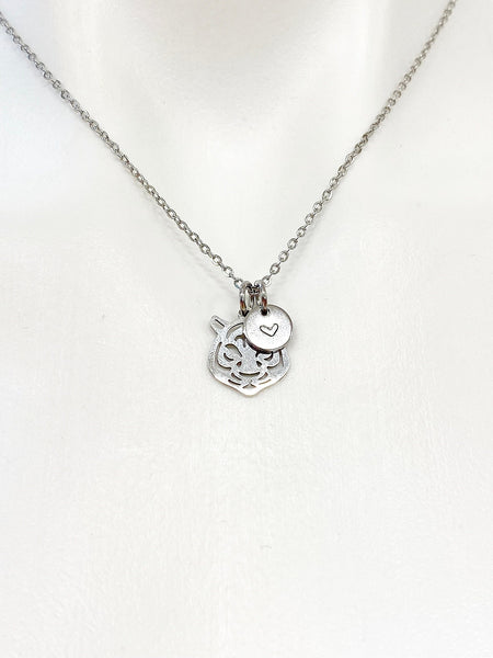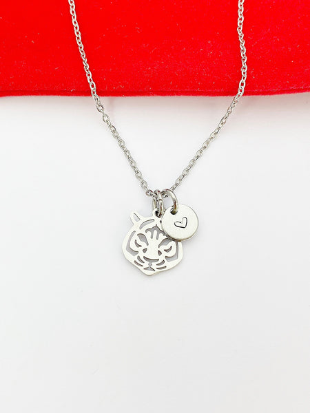 This is a stainless-steel tiger charm with hand stamped initial charm on stainless steel 18 inches chain.