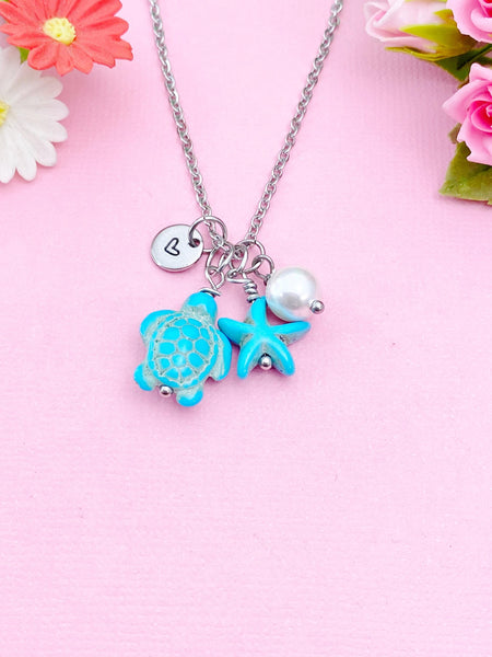 This is silver or gold tone turtle starfish and shell pearl charm with hand stamped initial charm on brass or stainless steel 18 inches chain.