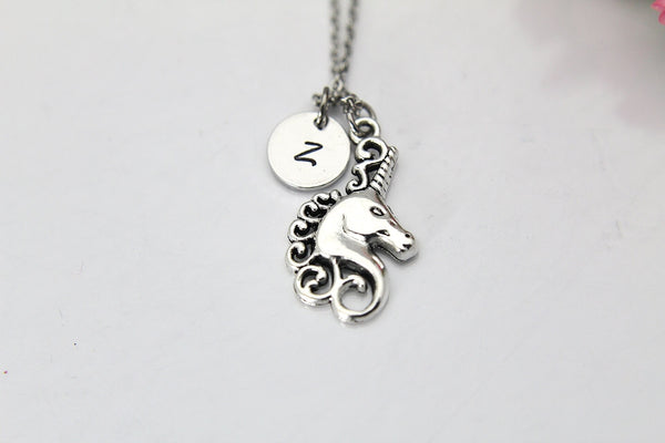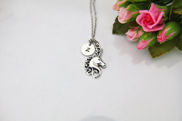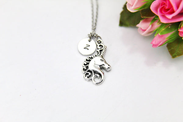 This is a silver-tone unicorn charm with hand stamped initial charm on a chain. You able to choose initial from a drop-down menu. You able to choose as a necklace, bracelet bangle or key chain.