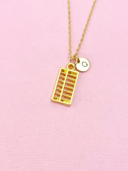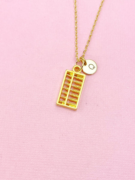This is a gold -tone abacus charm with hand stamped initial charm on brass/stainless steel 18 inches chain or bracelet or keyring.