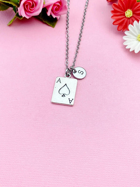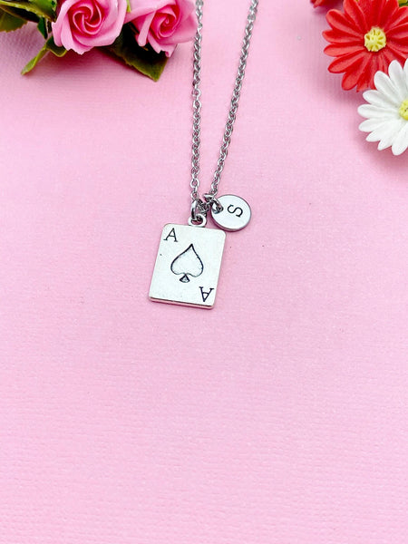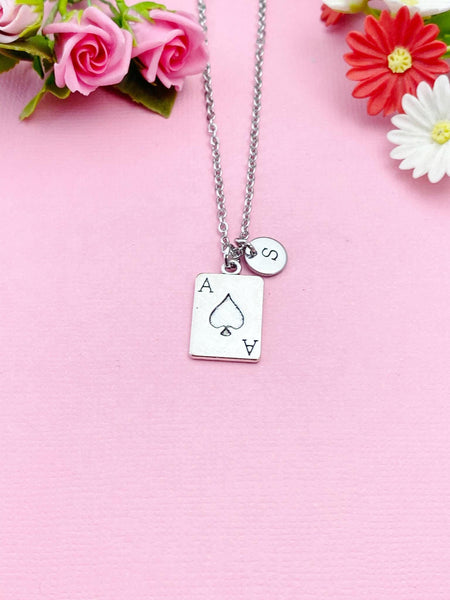This is a silver-tone Ace of Spades charm with hand stamped initial charm on stainless steel necklace.