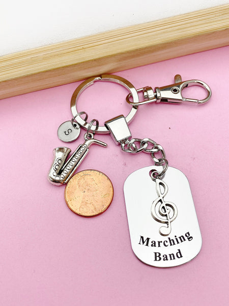 This is an engraving marching band on aluminum tag with Alto Saxophone, music not and hand stamp initial charm on key ring.
