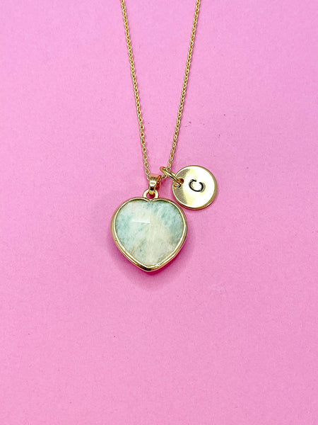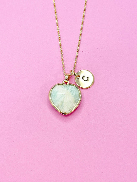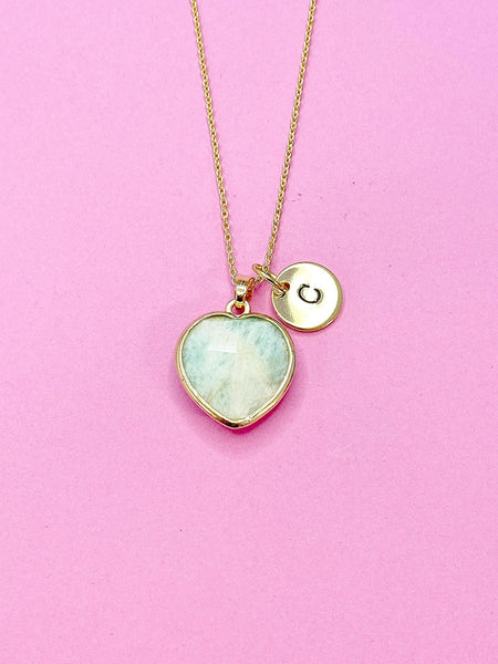 This is a gold tone Amazonite charm with hand stamped initial charm on brass or stainless-steel chain.