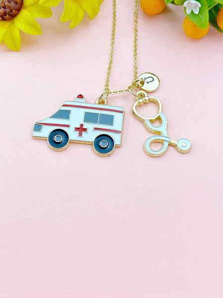 This is a gold -tone Ambulance Stethoscope charm with hand stamped initial charm on brass/stainless steel 18 inches chain or bracelet or keyring.