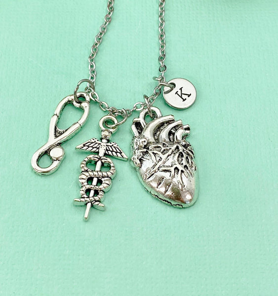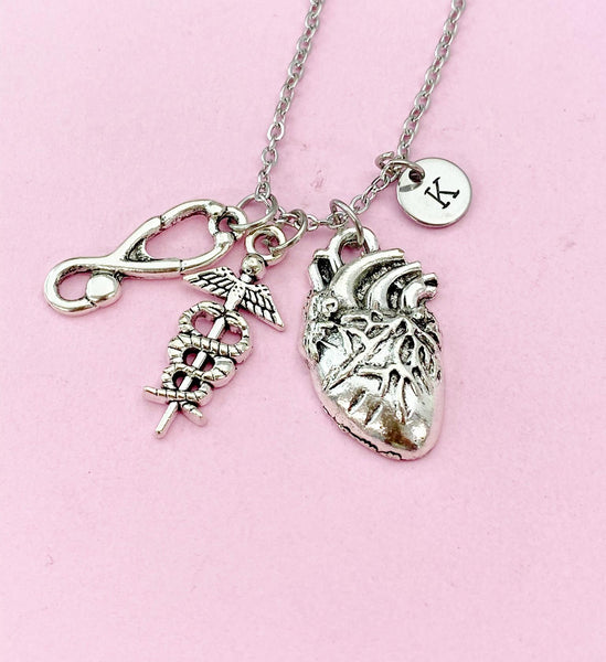 Anatomy Heart Stethoscope Caduceus Charm Silver Necklace, Cardiologist Gift, Medical School Student Gifts, N5283N