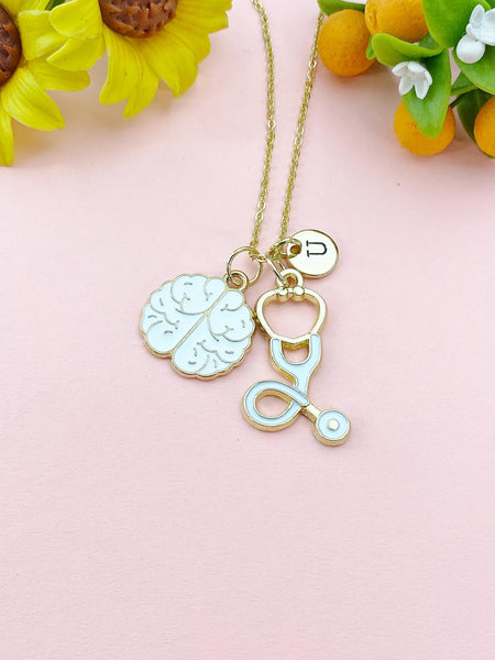 This is a gold -tone Anatomy Human Brain Stethoscope charm with hand stamped initial charm on brass/stainless steel 18 inches chain or bracelet or keyring.
