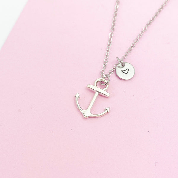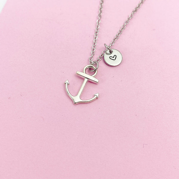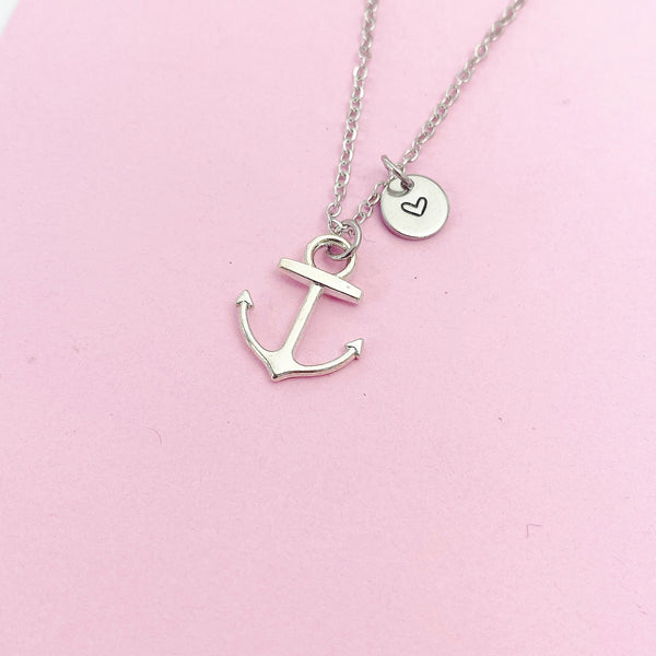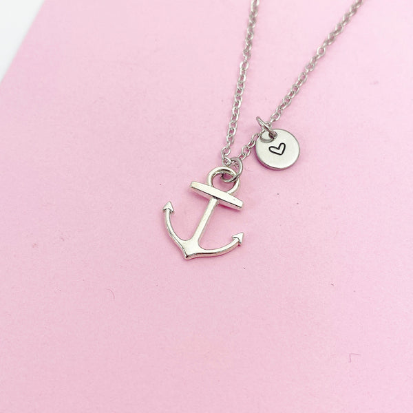 This is a silver-tone anchor charm with hand stamped initial charm on stainless steel necklace.