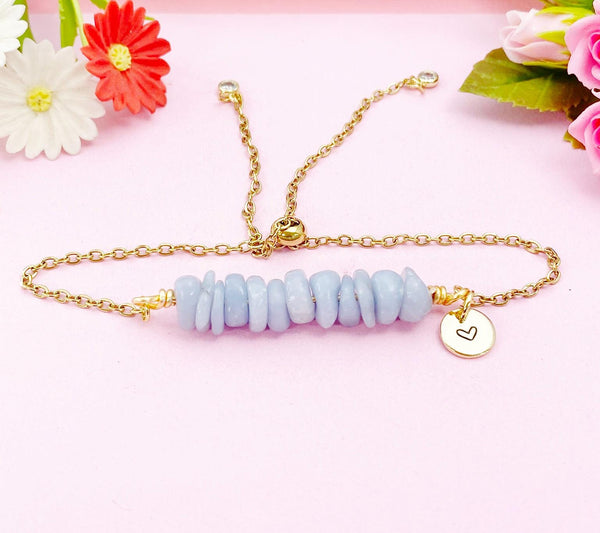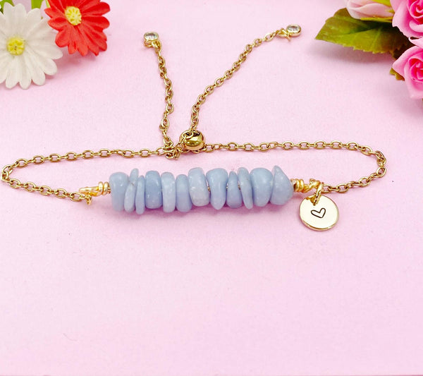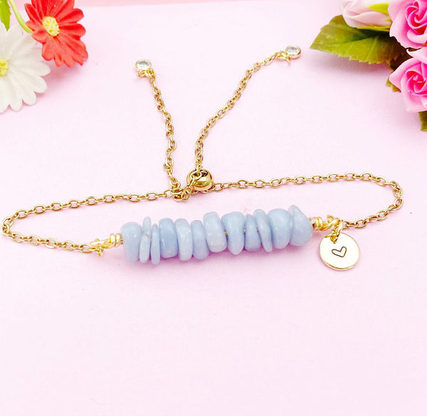 This is natural Angelite bar with hand stamped initial charm on brass or stainless steel chain.