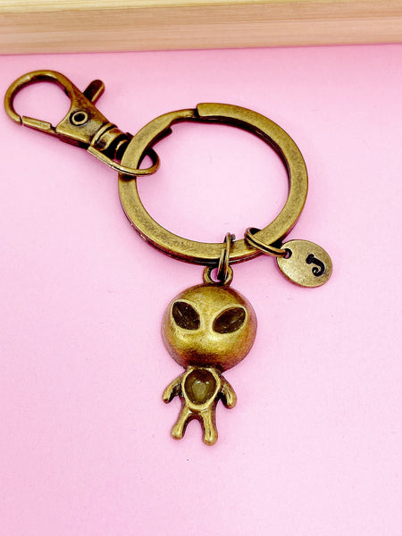 This is a bronze-tone alien charm with hand stamped initial charm on keyring.