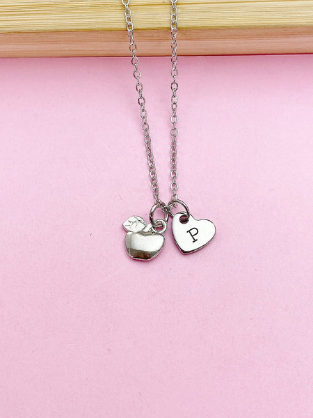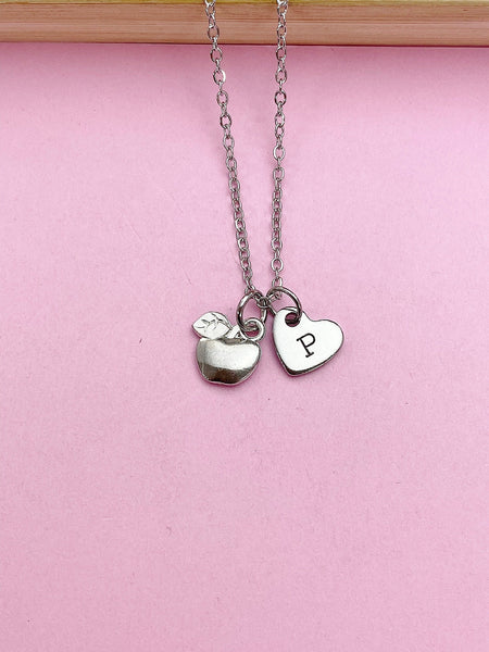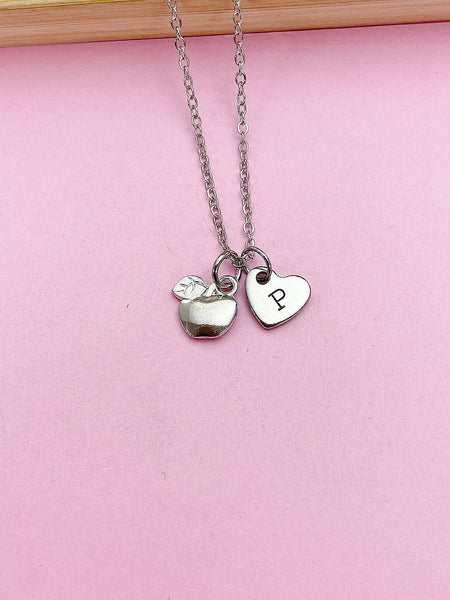 This is a silver-tone apple charm with hand stamped initial charm on stainless steel necklace.