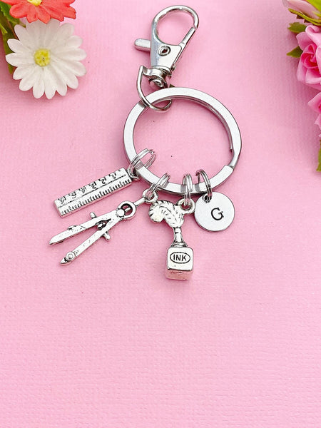 This is a silver-tone ruler, pencil compass, ink bottle charm with hand stamped initial charm on keyring.