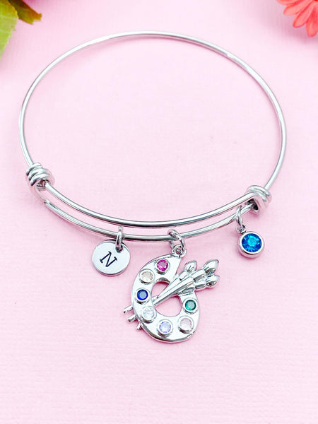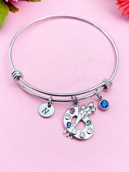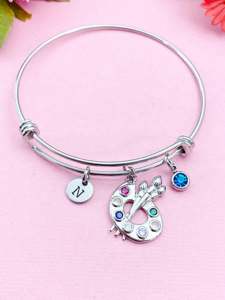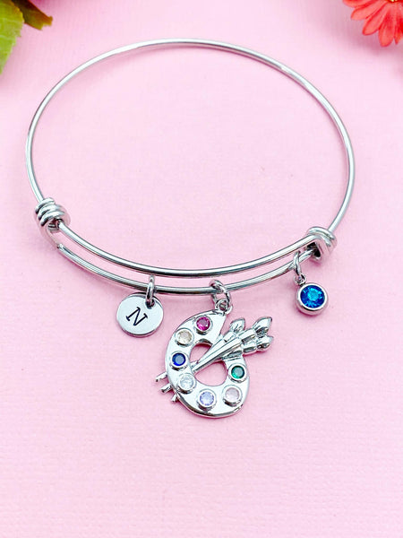 This is a silver-tone palette and birthstone charm with hand stamped initial charm on Tarnish Resistant stainless steel bracelet.