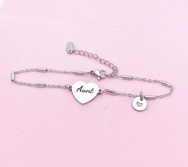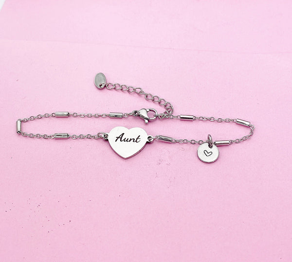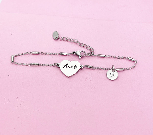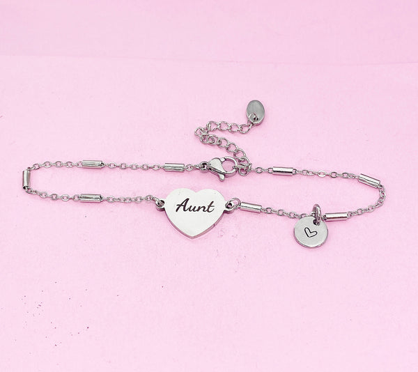 This is an engraving Aunt on stainless steel with hand stamp Initial charm on stainless-steel bracelet.