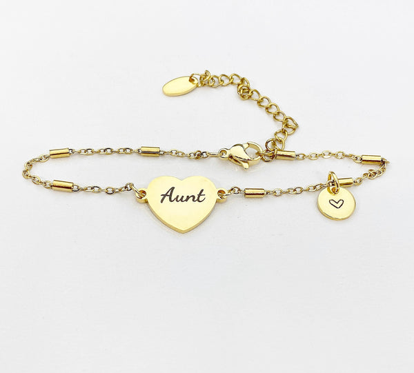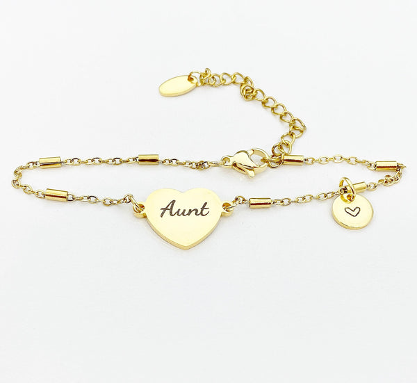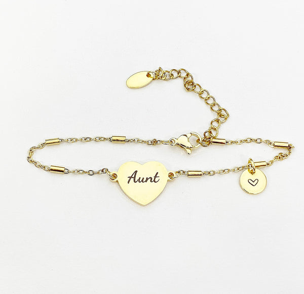 This is an engraving Aunt on stainless steel with hand stamp Initial charm on stainless-steel bracelet.