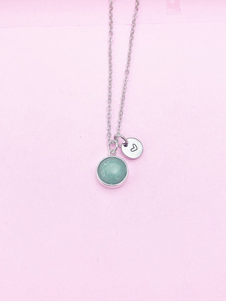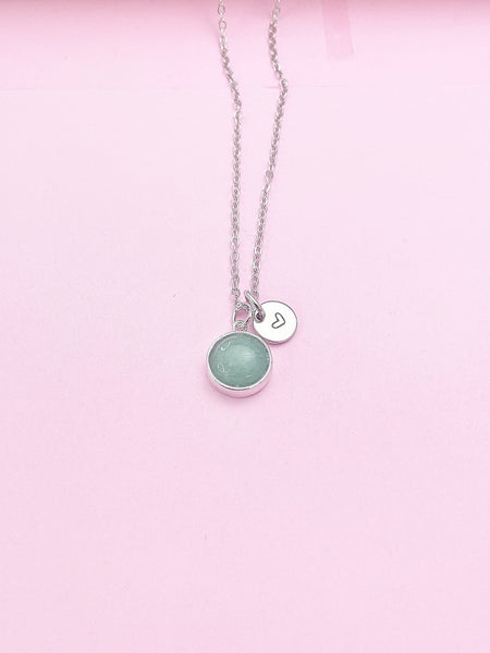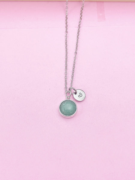 This is silver tone Green Aventurine charm with hand stamped initial charm on brass or stainless-steel chain.
