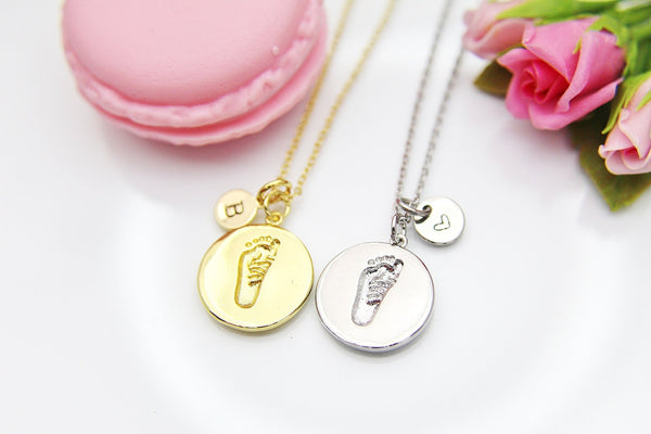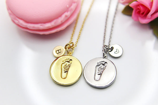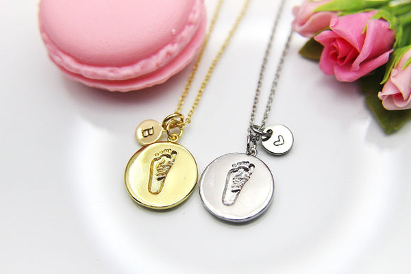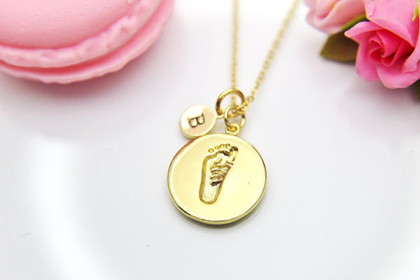 This is a gold-tone footprint charm with hand stamped initial charm on brass/stainless steel 18 inches chain.