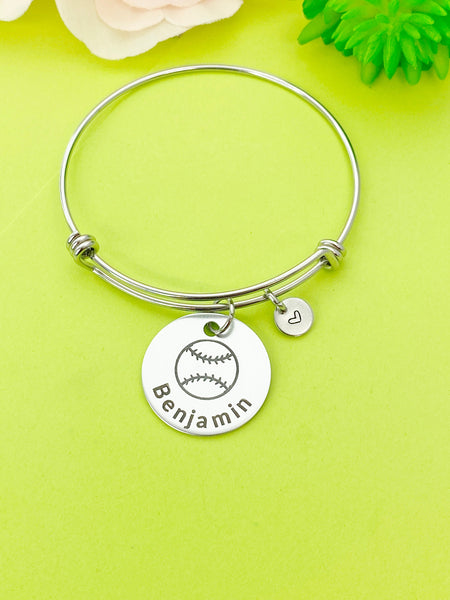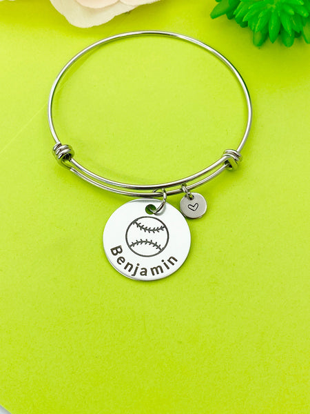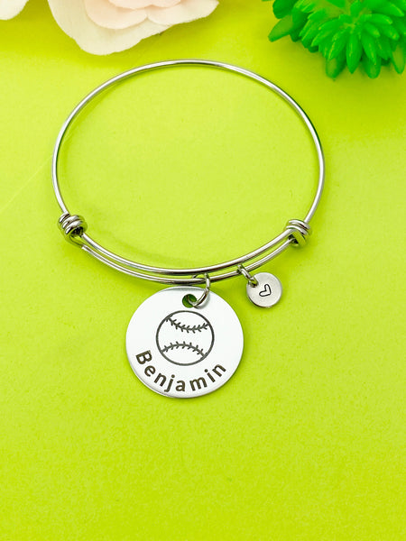 This is an engraving Baseball Ball and Name on stainless-steel or aluminum with hand stamped heart charm on stainless steel bangle or necklace or split key ring optional.