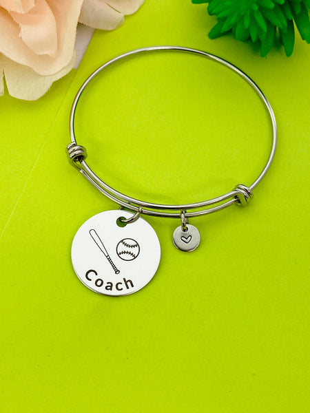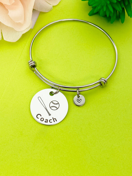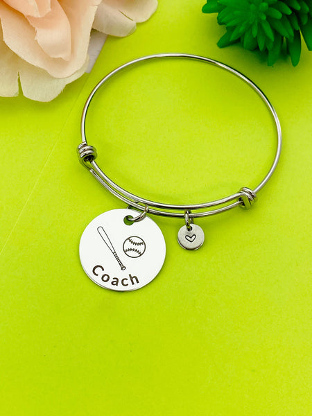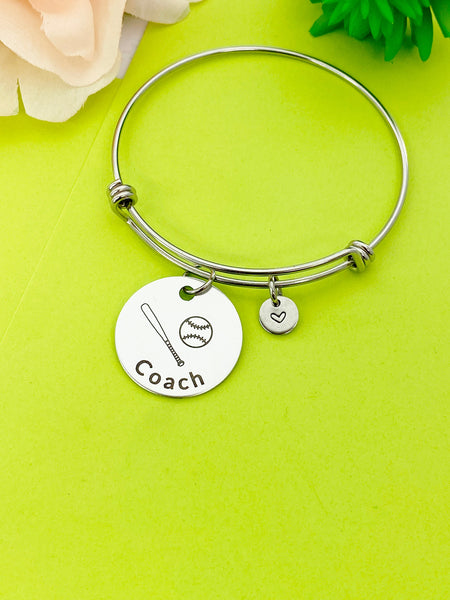This is an engraving Baseball Coach on stainless-steel or aluminum with hand stamped heart charm on stainless steel bangle or necklace or split key ring optional.