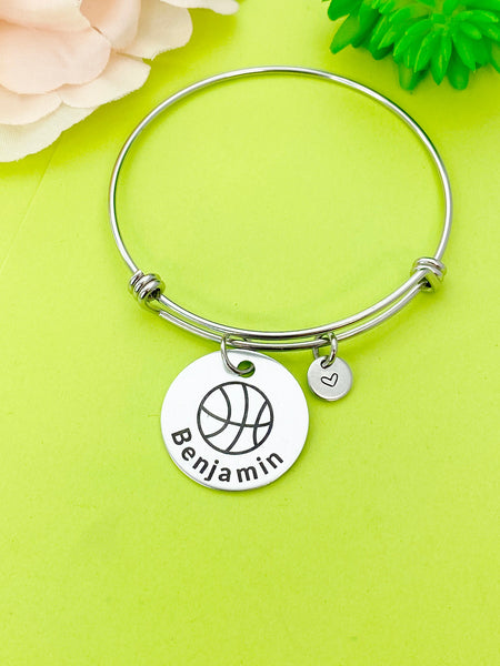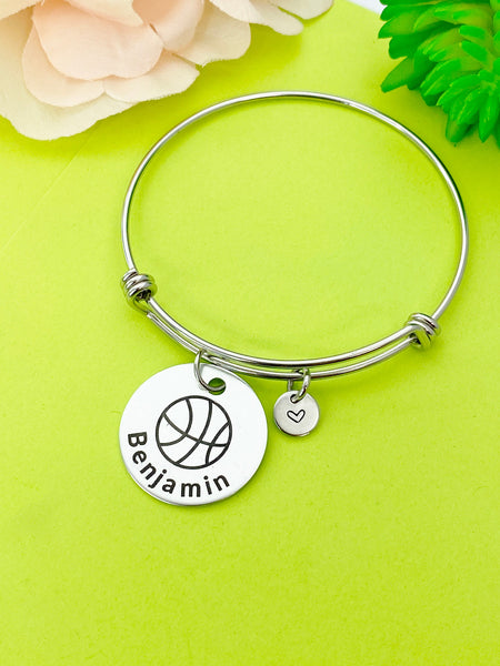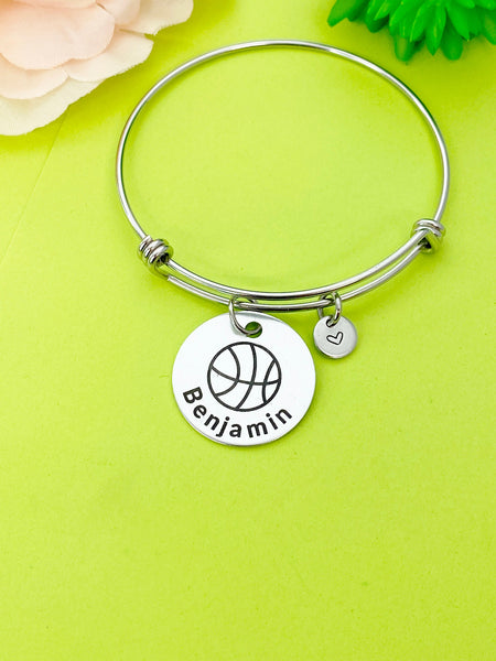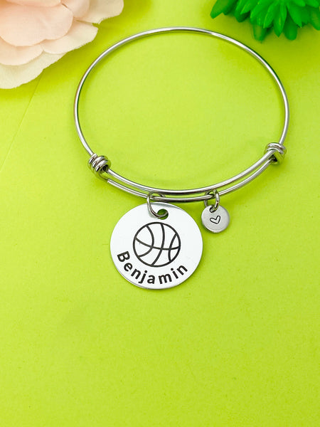 This is an engraving Basketball ball and Name on stainless-steel or aluminum with hand stamped heart charm on stainless steel bangle or necklace or split key ring optional.