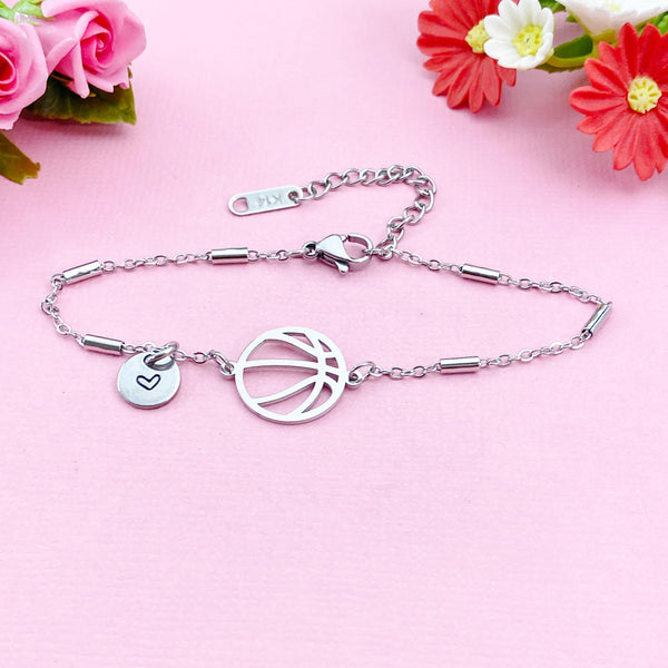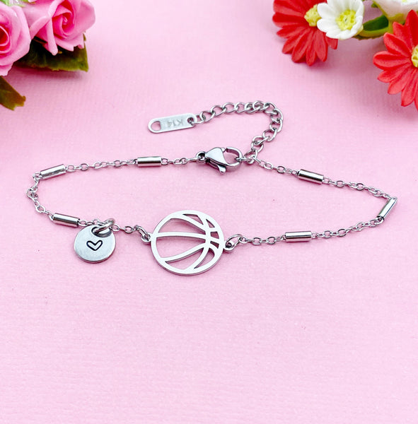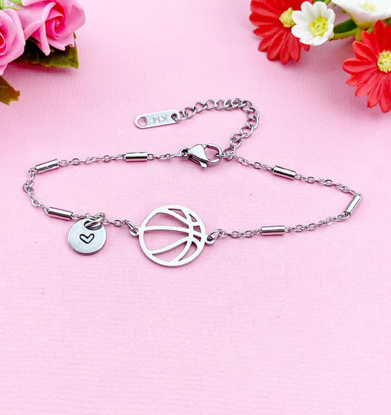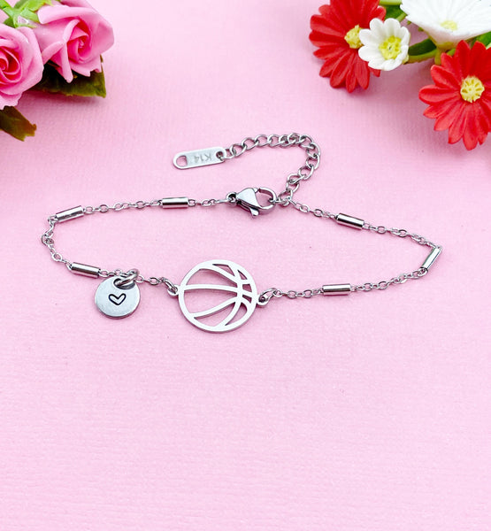This is a silver or gold -tone basketball charm with hand stamped initial charm on stainless steel chain.