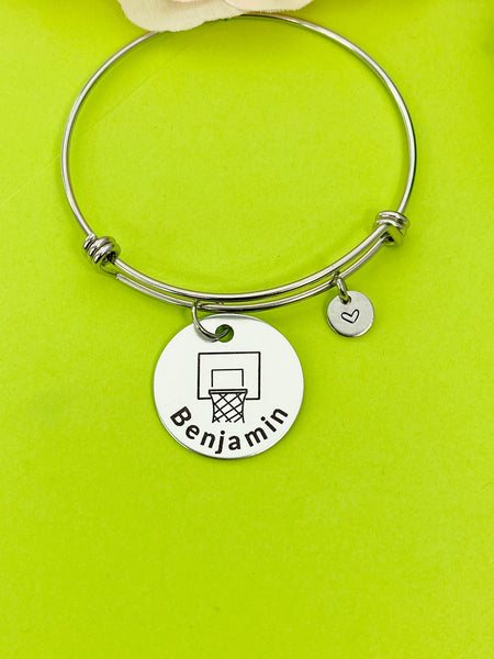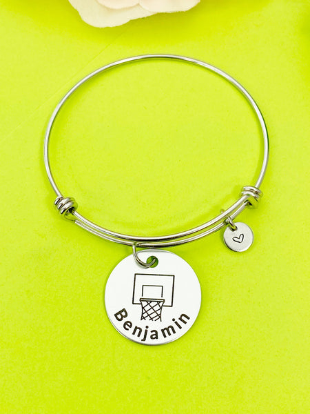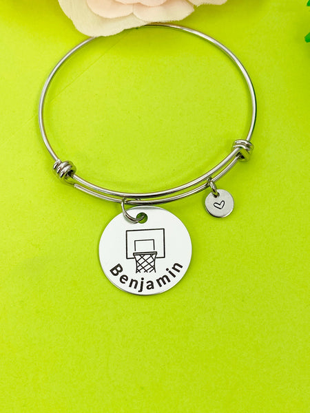 This is an engraving Basketball Hoop and Name on stainless-steel or aluminum with hand stamped heart charm on stainless steel bangle or necklace or split key ring optional.