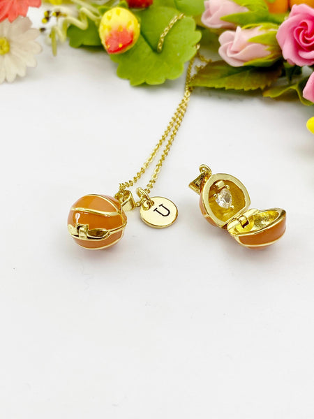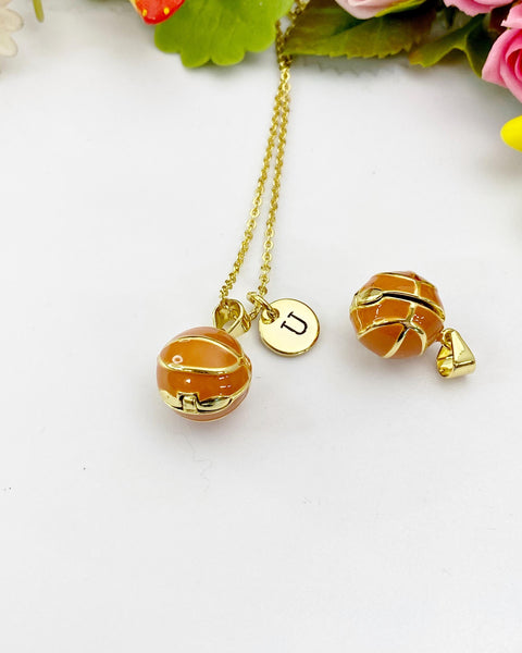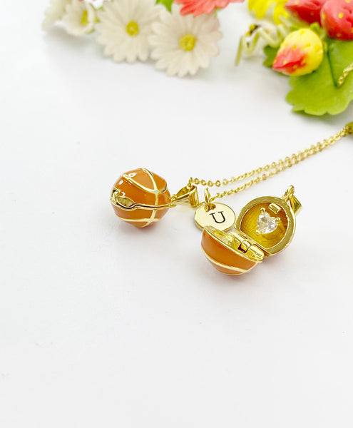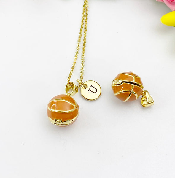 This is a gold -tone Basketball Brass Enamel Locket charm with hand stamped initial charm on brass or tarnish resistant stainless-steel chain.