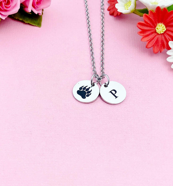 This is an engraving paw and initial on stainless steel charm on stainless steel necklace