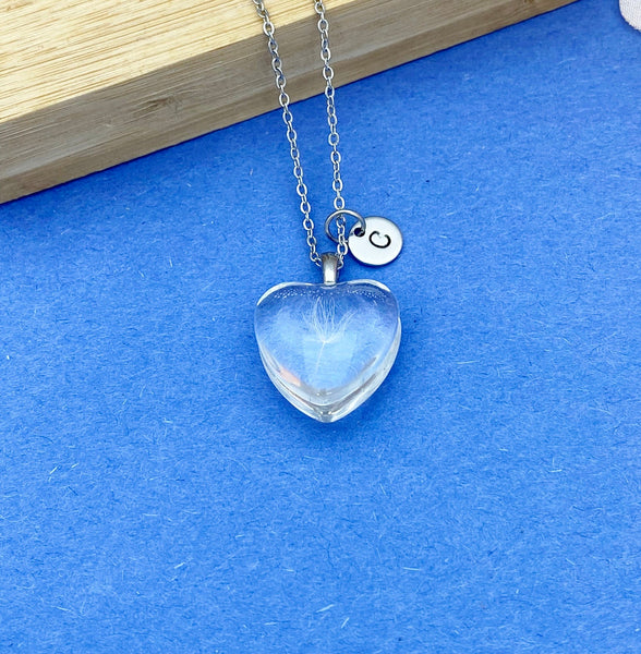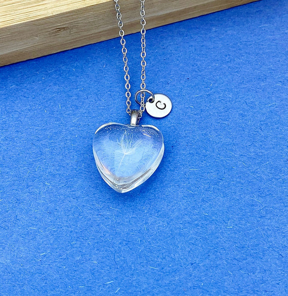 This is a beautiful real dried dandelion charm with hand stamped initial charm on a stainless steel chain.
