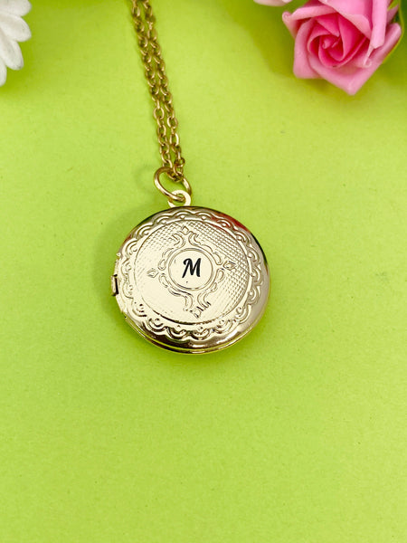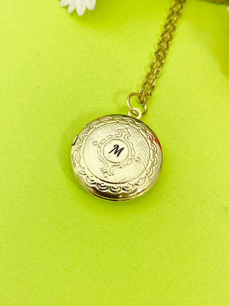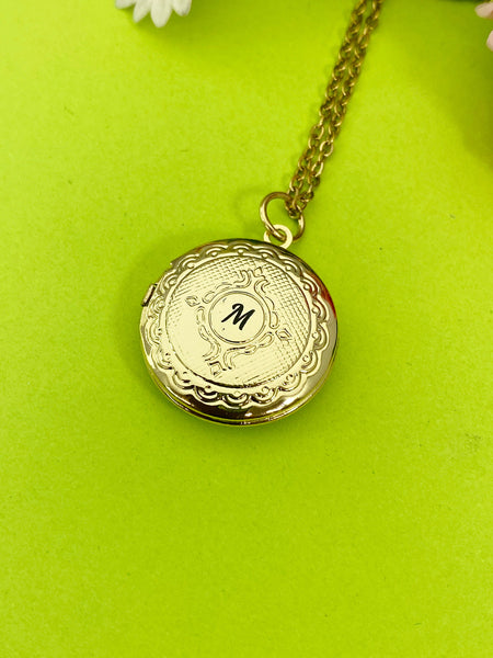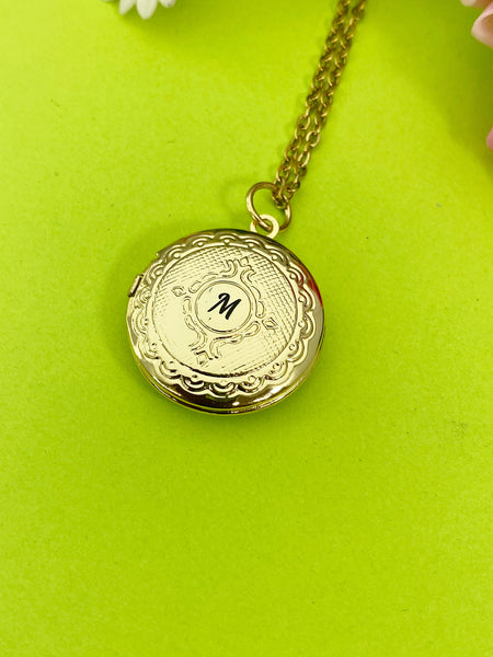 This is a unique engraving initial on the front of locket charm on gold plate stainless steel or brass 18 inches necklace chain. I do not put the photo to the locket.