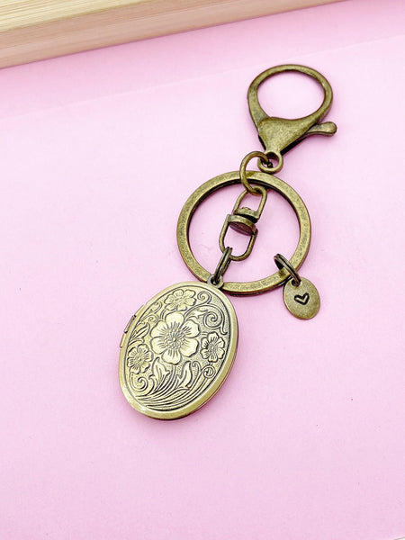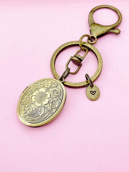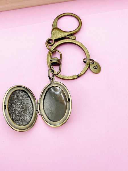 This is a bronze -tone locket charm with hand stamped initial charm on keyring.