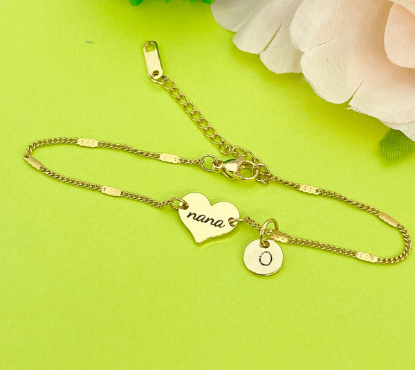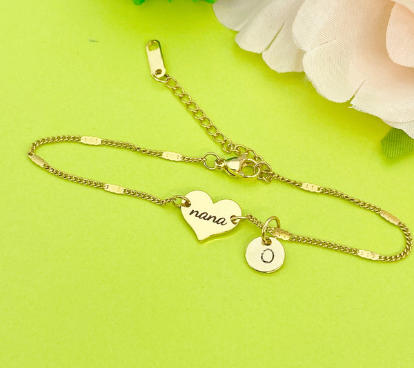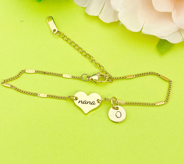 This is a Nana engraving on real18K gold plated brass heart charm with hand stamped initial charm on 304 Stainless Steel Figaro Chain Bracelet.