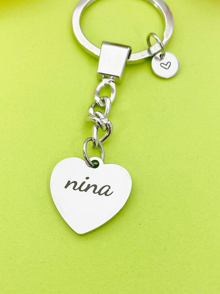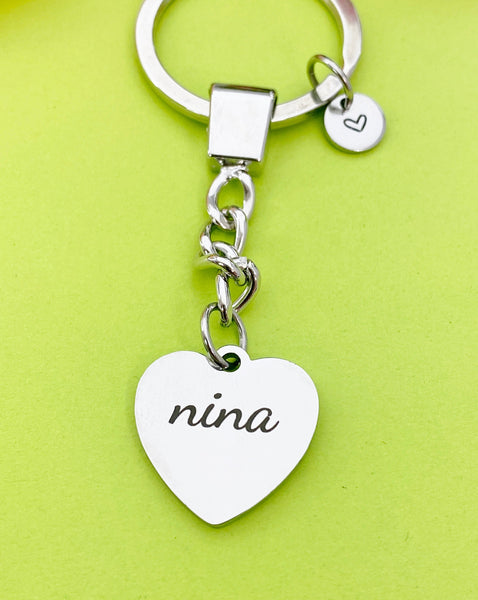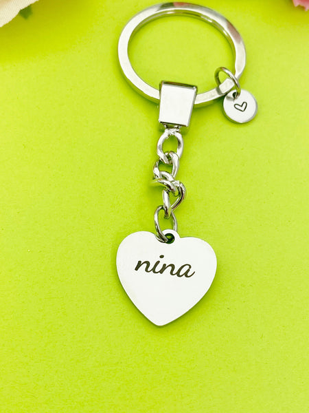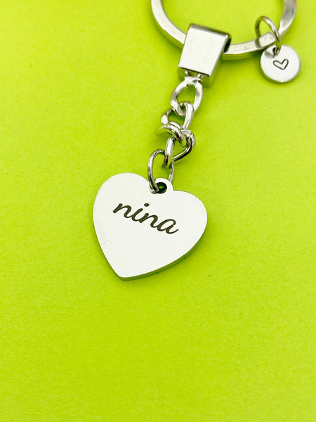 This is an engraving Nina on stainless-steel with hand stamped initial charm on stainless steel bangle or necklace or split key ring optional.