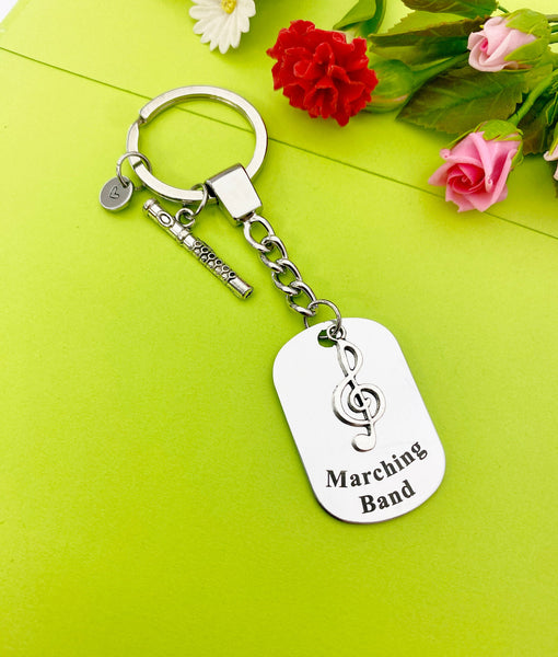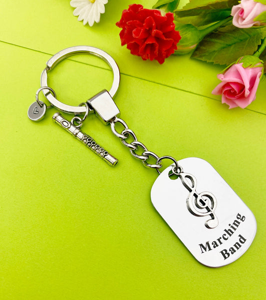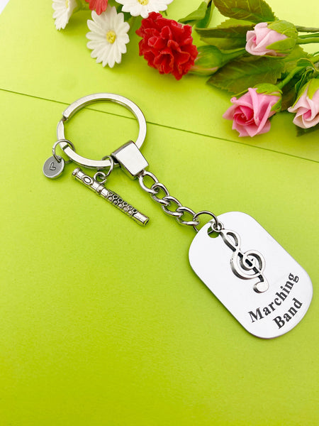 This is an engraving marching band on aluminum tag with flute, music not and hand stamp initial charm on key ring.