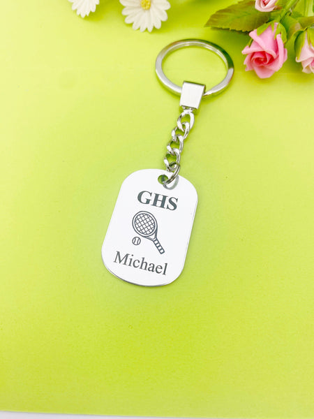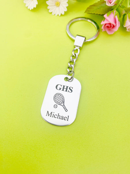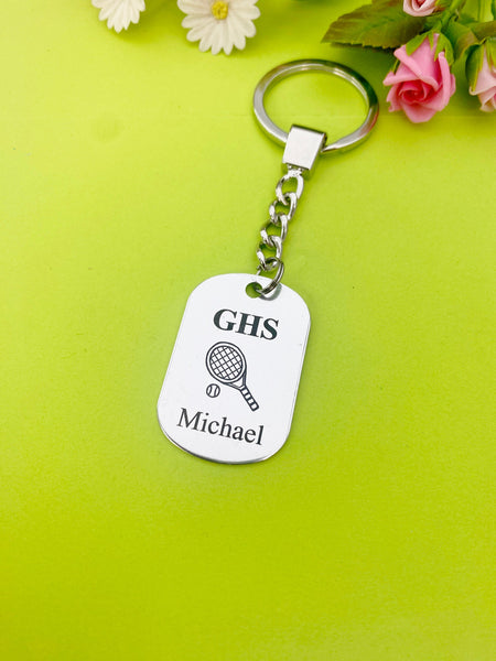 This is an engraving tennis, school abbreviation and name on aluminum tag on key ring.