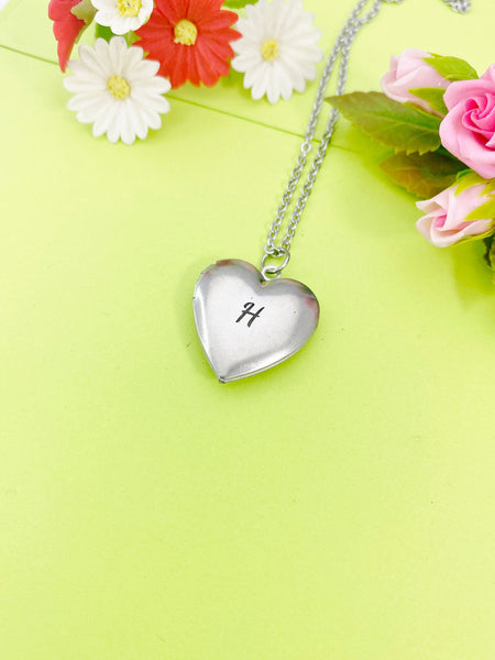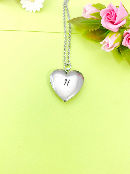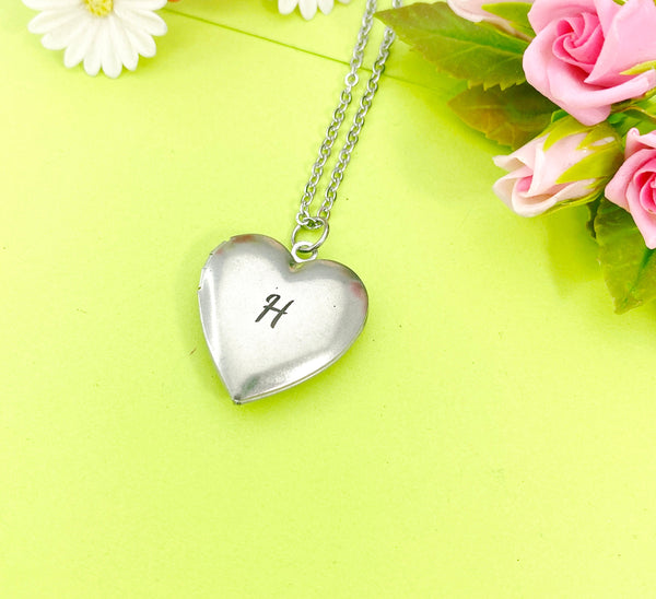 This is a unique engraving initial on stainless steel heart locket charm on stainless steel 18 inches necklace chain. I do not put the photo to the locket.