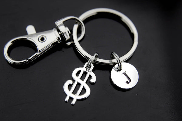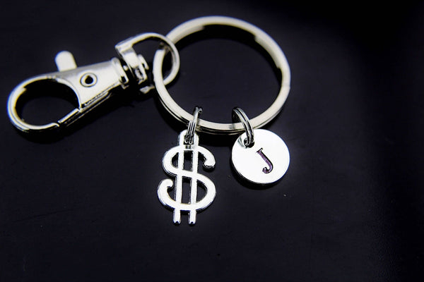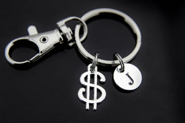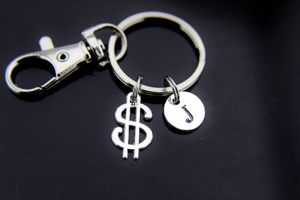 This is a beautiful silver dollar symbol charm with initial charm on the keyring. You able to choose initial from a drop down menu