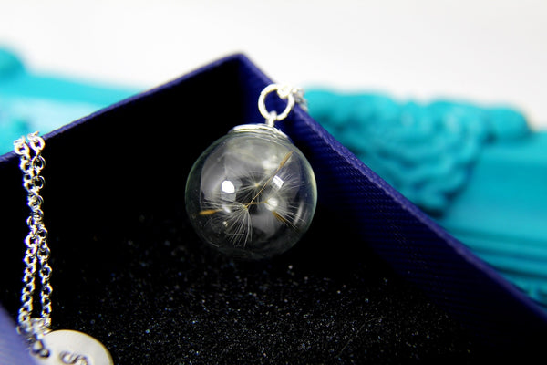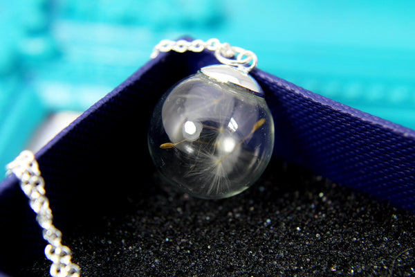 This is a beautiful real dandelion seed in glass glob ball charm on a stainless steel 18 chain.