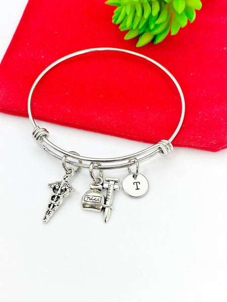 This is a silver tone caduceus and medical syringe charm with hand stamped initial charm on stainless steel bracelet.