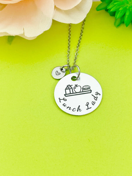 This is an engraving Lunch Lady on aluminum or stainless-steel with hand stamped initial charm on stainless steel necklace.