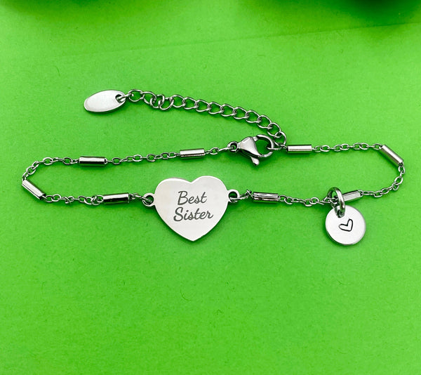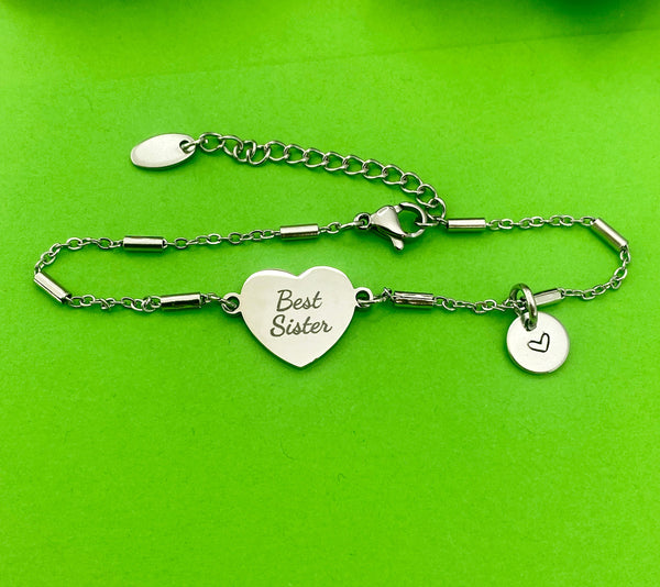 This is an engraving best sister on stainless steel with hand stamp Initial charm on stainless-steel bracelet.