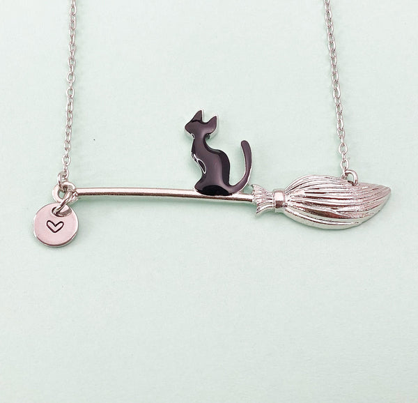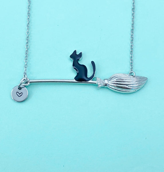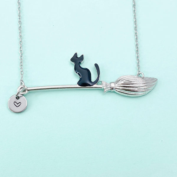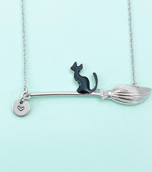 This is a gold -tone Black Cat Sit on Witches Broom with hand stamped initial charm on brass or stainless steel 18 inches chain.