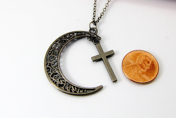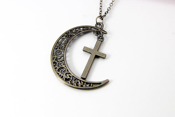 This is a black/gunmetal-tone moon, cross charm on a black chain.
